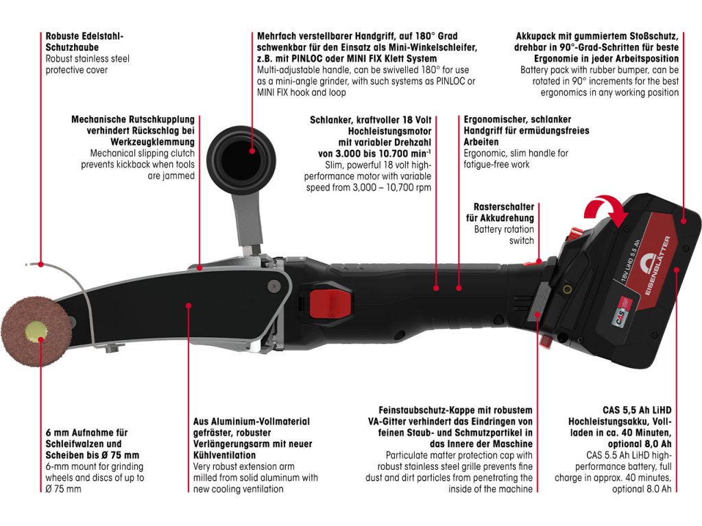 Nyní s variabilním rozsahem otáček od 3 000 do 10 700 ot./min – ideální pro všechny nástroje se stopkou 6 mm, systém MINI FIX Velcro, ROLOC™ nebo PINLOC. Obzvlášť robustní prodlužovací rameno umožňuje všestrannou práci kdekoli. Mini podélná, úhlová a rozbrušovací bruska v jednom!