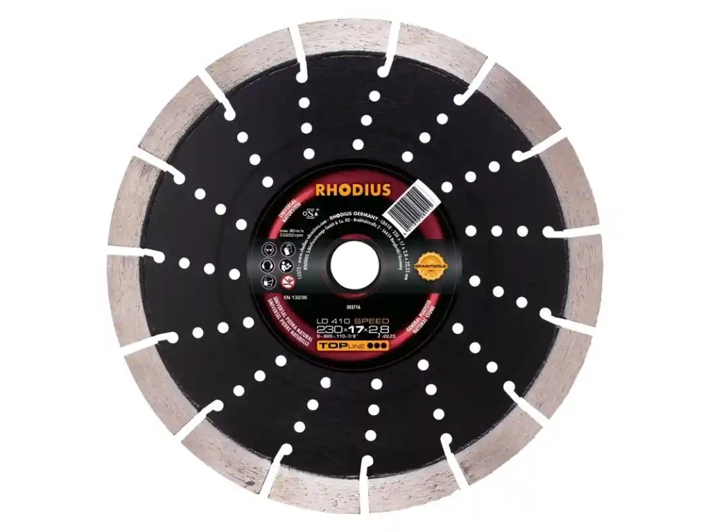 Diamantový řezný kotouč LD410 SPEED Řeže nejtvrdší kámen jako granit čistě a extrémně rychle. Umožňuje to nově vyvinutá technologie kovaných segmentů s vysokou hustotou a bezporézností spoje. Proto se vyznačuje LD410 SPEED v porovnání s konvekčními diamantovými kotouči enormní rychlostí řezání a životností. Lepší vlastnosti spoje segmentů a ocelového jádra vedou ke snížení nebezpečí rozlomení. Díky rovnoměrnému a úzkému rozestupu mezi segmenty je zatížení vibracemi minimalizováno. Nově vyvinutá kovářská technologie umožňuje výšku segmentů až 17 mm. Materiál: tvrdý přírodní kámen (např. granit) armovaný beton vymývyný beton stavební materiály, cihla, šamot Příklady použití: dlažební kameny sklepní dlažby spojovací dlažba otvory ve stěnách řezání dlažeb okenní otvory schody BRAINTOOLS - jsou zvláště inovované výrobky s jedinečnou použitelností a bezproblémovým řešením.Doplňkové parametry