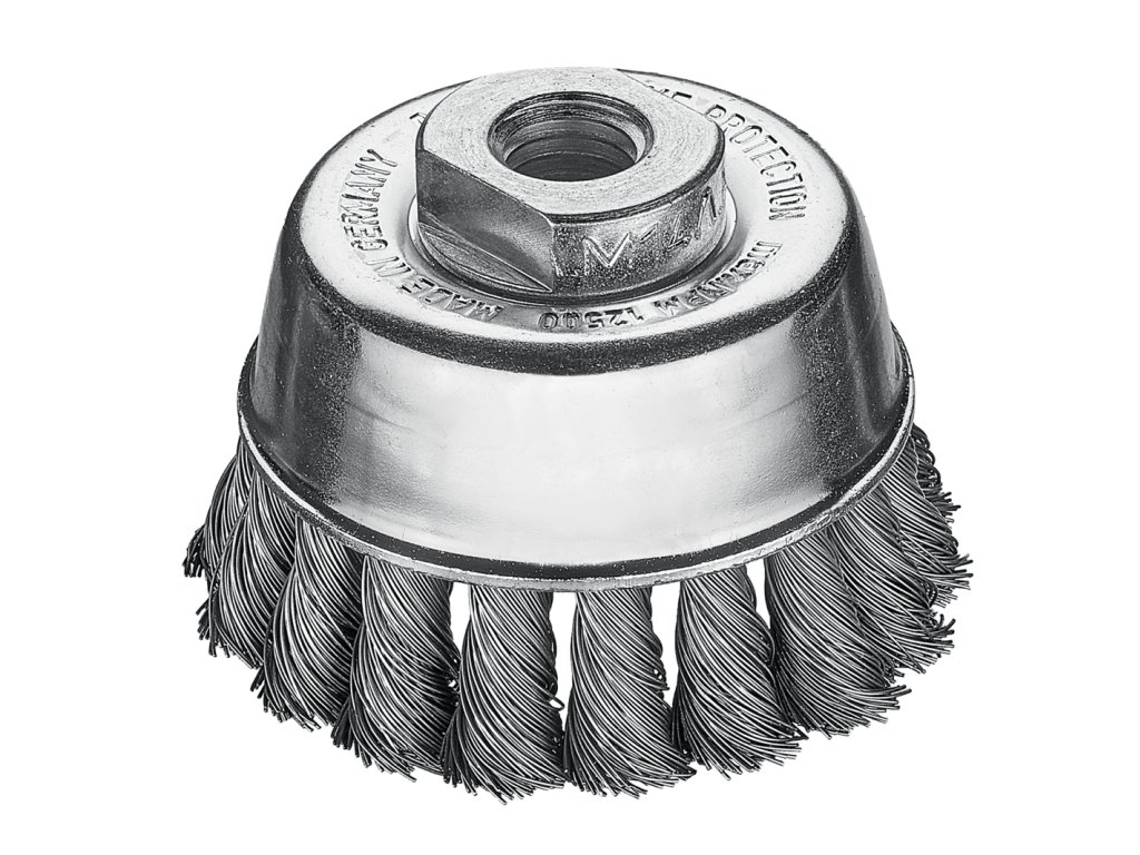 Splétané hrncové kartáče Splétané hrncové kartáče jsou ideální pro těžké opracování kartáči. k předpřípravě kovových povrchů k lakování nebo k odstranění strusky, rzi, okují a zbytků betonu. Provedení s o 80, 100 a 125 mm jsou vybaveny praktickým přítlačným kroužkem: slouží ke stabilizaci a lze jej snadno odstranit, když je spotřebován přetáčecí drát. Tím je k dispozici dalších 20mm drátu. Tip pro uživatele: Zkuste náš kartáč ø 90 mm pro malou úhlovou brusku. Ve srovnání s běžným kartáčem ø 65 mm má tento model o 50 % více drátu. STH = vysokopevný ocelový drát, rovnýDoplňkové parametry