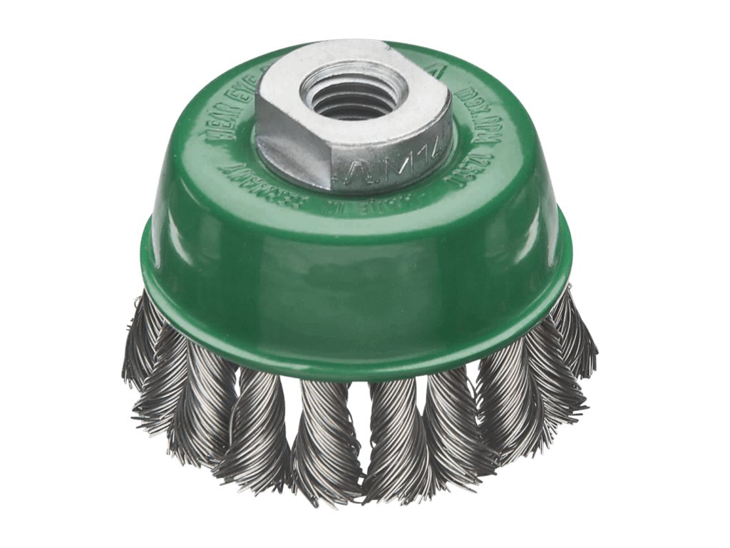 Splétané hrncové kartáče Splétané hrncové kartáče jsou ideální pro těžké opracování kartáči. k předpřípravě kovových povrchů k lakování nebo k odstranění strusky, rzi, okují a zbytků betonu. Provedení s o 80, 100 a 125 mm jsou vybaveny praktickým přítlačným kroužkem: slouží ke stabilizaci a lze jej snadno odstranit, když je spotřebován přetáčecí drát. Tím je k dispozici dalších 20 mm drátu. Tip pro uživatele: Zkuste náš kartáč ø 90 mm pro malou úhlovou brusku. Ve srovnání s běžným kartáčem ø 65 mm má tento model o 50 % více drátu. ROH = vysokopevný nerezový drát, rovnýDoplňkové parametry