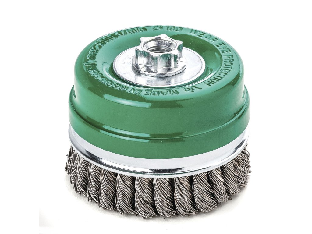 Splétané hrncové kartáče Splétané hrncové kartáče jsou ideální pro těžké opracování kartáči. k předpřípravě kovových povrchů k lakování nebo k odstranění strusky, rzi, okují a zbytků betonu. Provedení s o 80, 100 a 125 mm jsou vybaveny praktickým přítlačným kroužkem: slouží ke stabilizaci a lze jej snadno odstranit, když je spotřebován přetáčecí drát. Tím je k dispozici dalších 20 mm drátu. Tip pro uživatele: Zkuste náš kartáč ø 90 mm pro malou úhlovou brusku. Ve srovnání s běžným kartáčem ø 65 mm má tento model o 50 % více drátu. ROH = vysokopevný nerezový drát, rovnýDoplňkové parametry