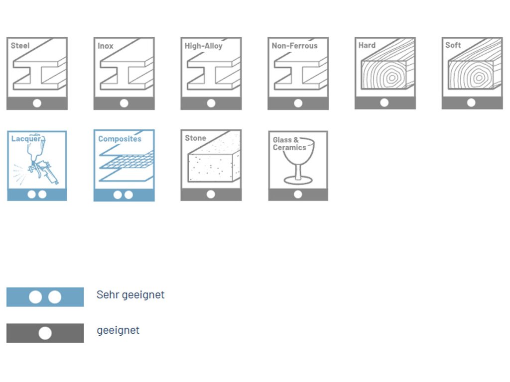 | Broušený materiál: | kámen, nerez, ocel, vysokolegované slitiny, tvrdé dřevo, lakovaný povrch, kompozity, dyhované desky, sklo, keramika |