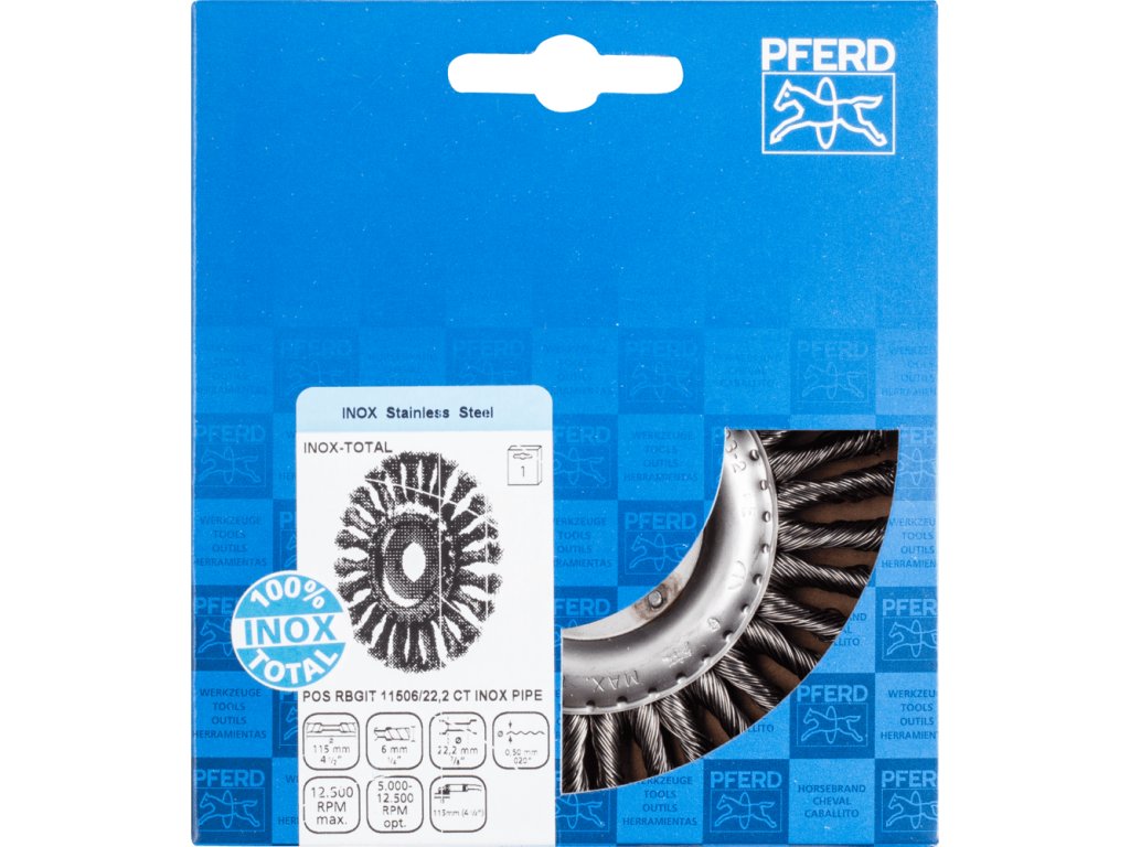 Na nerezavějící ocel (INOX) nabízí PFERD TOOLS kartáče i ve verzi INOX-TOTAL, kromě kartáčů s nerezovými štětinami. Tyto kartáče jsou obzvlášť vhodné pro použití v extrémně kritických prostředích.