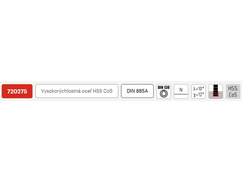 | Materiál nástroje: | HSS Co5 - vysokovýkonná rýchlorezná oceľ pre materiály do 1200 MPa |