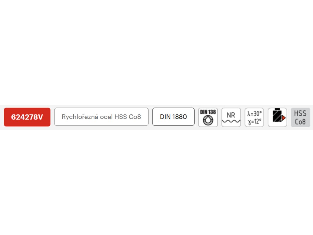 Vhodné pro opracování: automatové a konstrukční oceli ≤ 600 N/mm2 konstrukční a lité oceli ≤ 850 N/mm2 zušlechtěné oceli ≤ 900 N/mm2 nerezové oceli 750-850 N/mm2 litina > 240 N/mm2 Cr-Ni slitiny ≤ 1500 N/mm2 DIN 138 DIN 1880 Materiál nástroje - HSS Co5 Typ NR - pro hrubování materiálů s nižší až střední pevností (do 700 MPa), opracování Ra 12,5 a hrubší.Doplňkové parametry