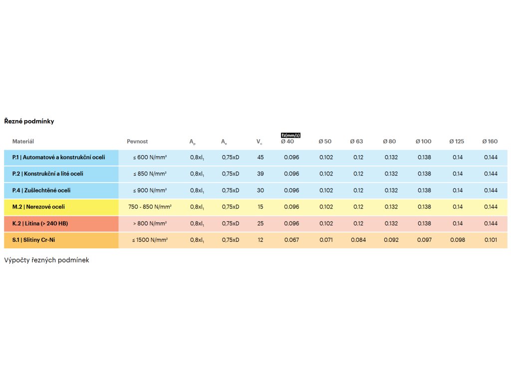 | Frézovaný materiál: | Automatová a konstrukční ocel < 600 N/mm2, Konstrukčná a lité oceli < 850 N/mm2, litina > 240 HB, Nerezová ocel 750-850 N/mm2, slitiny Cr-Ni (Nimonic, Hastelloy ...) ≤ 1500 N/mm2, Zušlechtěné oceli < 900 N/mm2 |